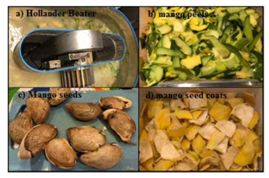 Hollander beater and mango residues, (a) Hollander beater, (b) mango peels, (c) mango seeds, and (d) mango seed coats.