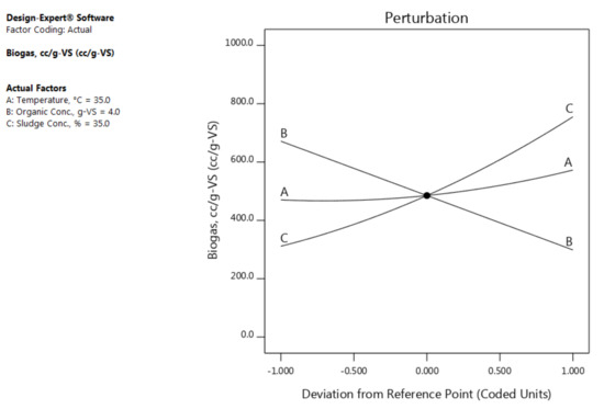 The perturbation plot (Figure 2) illustrates the behaviour of each factor on the response. As it can be noted, the temperature (A) has a slight positive influence on the volume. However, increasing the organic concentration (B) decreases the biogas volume. It is also clear that, the sludge concentration (C) is in direct proportion with the biogas volume produced from g-VS.