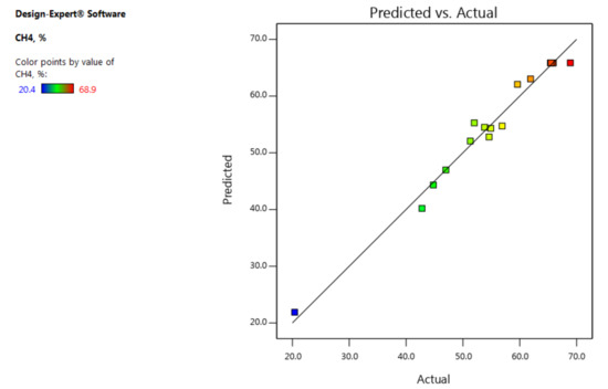 Figure 7 indicates that, there was a reasonable correlation between the model’s predicted results and the actual ones. The perturbation plot (Figure 8) has also shown that the behaviours of all factors with the CO2% are almost opposite to the behaviours found for the CH4%.