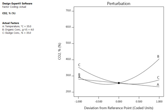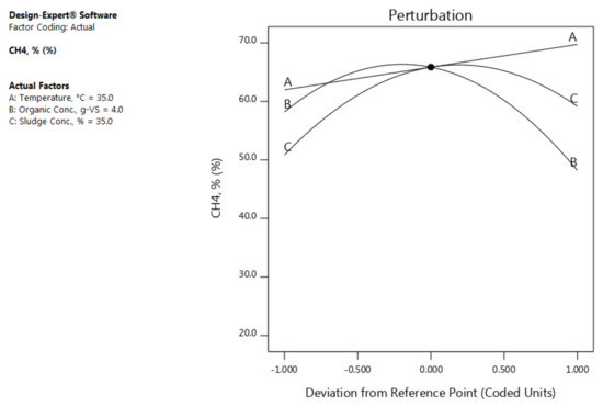 According to the perturbation plot in Figure 4, the CH4% increases as the temperature increases in the studied range. While, it is increases as the organic concentration (B) increases until it is reaches just before the reference point (4.05 g-VS) and begins to decline gradually. In terms of the sludge concentration (C) influence, the CH4% increased as the concentration of the sludge increased until the concentration of the sludge reached approximately 40% and then the CH4% started to decrease slightly.