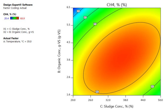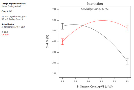 The interaction and contour plots are provided to illustrate the influences of the interactions of the factors. Figure 5 and Figure 6 show the interaction and contour plots of the influence of the interaction of the organic concentration and sludge concentration on the CH4%. It is obvious that, when the organic concentration is at the lowest level, changing in the sludge concentration does not make a big difference on the CH4%, but when the organic concentration is at the highest level, a significant variation in the CH4% can be observed when the sludge concentration is increased or decreased. In addition, when the sludge concentration is kept at the lowest level and the organic concentration increases in the studied range, thus the CH4% stays at approximately a constant level and then remarkably decreases after the organic concentration has reaching approximately 2.8 g-VS.