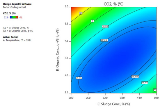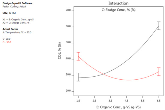 Relatively, the same concept of the influence of the (BC) on CH4% is applicable to its effect on the CO2% but in an opposite manner. For instance, when the organic concentration is at the highest level, a significant variation in the CO2% can be observed when the sludge concentration is moves from its lowest to its highest levels (see Figure 9 and Figure 10). However, based on the analysis of the CO2% response and by looking back into the analysis of the CH4% response, the same terms have a significant effect on both responses but to varying degrees. In comparison between the results of the concentrations of both CH4% and CO2% which have been measured from each run, it is evident that the increase in CH4% is associated with a decrease in CO2% and vice versa.