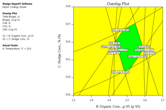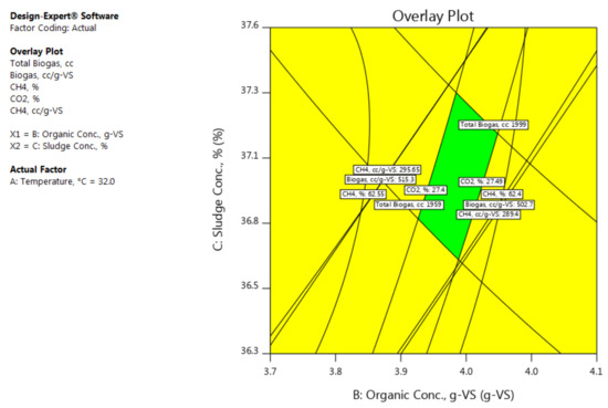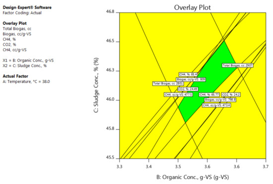 Moreover, an observation has been drawn from the results that, the sludge concentration (C) as well as the organic concentration (B) have significant influences on the quantity and quality of the biogas produced. As it can be noted from the results of the biogas produced from each bioreactor, excessive feeding of the digester with the substrate did not increase the biogas quantity and quality. This implies, the excessive feeding makes the bacteria idle and therefore, they do not digest the whole substrate inside the digester. Thus, the concentrations of the fedstocks and the inoculum must be well balanced inside the digester. In addition, the careful determination of the concentrations of the inoculumand fedstock greatly helps avoiding the inhibition of the growth of the bacteria and the distortion of their metabolism. That would also help avoiding the imbalance of the bacterial population, VFA accumulation and reactor failure [43,44]. It was also observed that the temperature has a lower significant influence on the quantity and quality of the biogas produced than the influences of the organic concentration g-VS and sludge concentration.