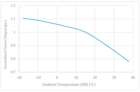 Nevertheless, the power—temperature characteristic has the general shape of Figure 1. The net capacity of the units is given under ISO conditions (15 °C, 1 atm). This corresponds to the normalized output equal to 1 in this figure.