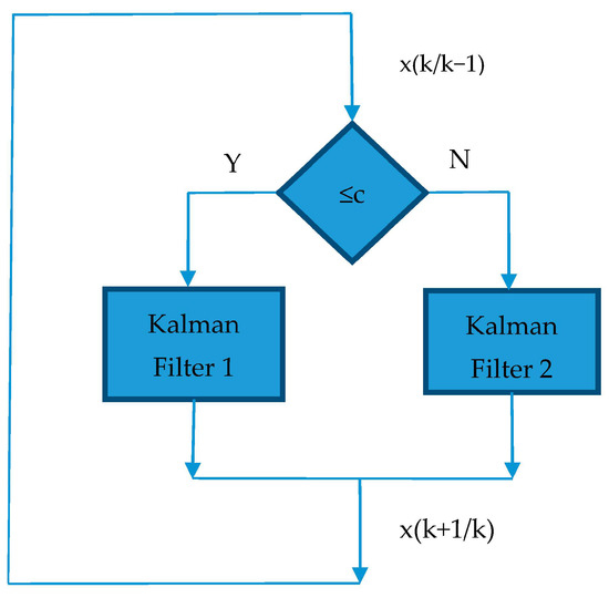 It is worth noting that, due to the form of the function h(x(k)), the above Extended Kalman Filter is equivalent to the combined use of two Time Varying Kalman Filters depending on the prediction value x(k/k − 1). The first Kalman Filter is used when x(k/k − 1) ≤ c with parameters H1 = a1, s1 = d1. The second Kalman Filter is used when x(k/k − 1) > c with parameters H2 = a2, s2 = d2. This is shown in Figure 2.