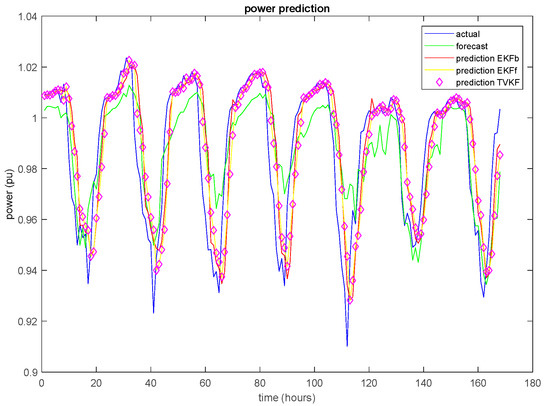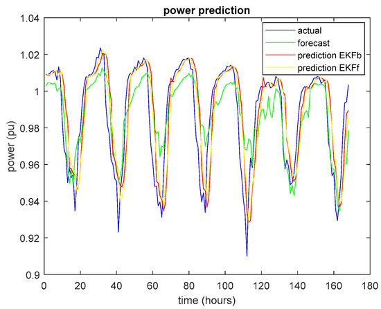 In addition, it has been shown that the EKF in the nonlinear case presented here is equivalent to two Time Varying Kalman Filters (TVKFs). The output power predicted using EKF-b with b = 3 and EKF-f with f = 720, on the one hand, and the combination of two TVKFs, on the other hand, are compared in Figure 5. The actual power, the power forecast according to the NWP model, and the predicted power by EKF and two TVKFs are plotted for one week (168 h). The algorithms provide equivalent predictions.