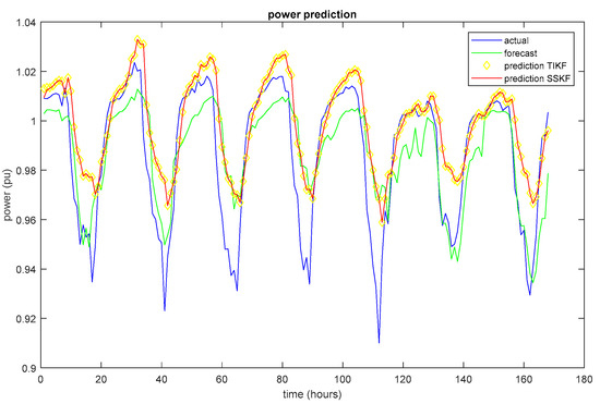 Figure 6 depicts the ouput power prediction, using TIKF-f and SSKF-f with f = 720. The actual power as provided by the P-T curve for actual temperature measurements, which is the power forecast as obtained from the P-T curve based on the NWP forecast temperature, and the predicted power by TIKF and SSKF are plotted for 1 week (168 h). The proposed KF algorithms reproduce the trend of the actual power generation curve and the results are generally closer to the actual power than the output power forecast based on the NWP forecast temperature.