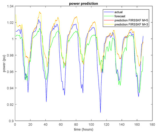 Figure 7 depicts the results for the output power prediction when FIRSSKF-f-ε is used with f = 720 and (M = 5) and (M = 3). The actual power as provided by the P-T curve for actual temperature measurements, the power forecast as obtained from the P-T curve based on the NWP forecast temperature, and the predicted power by SSKF with FIR length M = 3 and M = 5 are plotted for 1 week (168 h).The proposed KF algorithms reproduce the trend of the actual power generation curve and the results are generally closer to the actual power than the output power forecast based on the NWP forecast temperature. It is confirmed that the FIR length does not affect the filters’ efficiency.