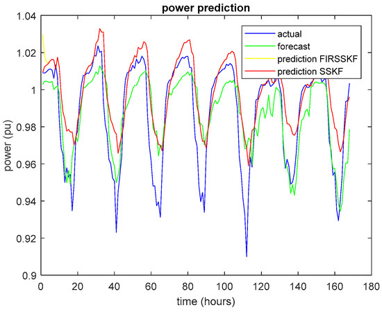 In addition, it was confirmed that SSKF and FIRSSKF compute predictions very close to each other. The results for the power prediction, using SSKF and FIRSSKF with f = 720 and are depicted in Figure 8. The actual power, the power forecast according to the NWP model, and the predicted power by SSKF and FIRSSKF are plotted for one week (168 h). The algorithms provide similar predictions.
