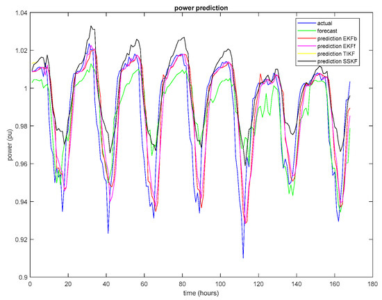 Figure 9 shows the comparison of all KF implementations against output power calculated based on actual and forecasted temperature profiles. Results are shown for the power generation prediction for one week (168 h), using EKF, TIKF, and SSKF with b = 3, f = 720, . All algorithms perform well and follow the general trend of the actual power generation curve offering an improved prediction compared to the power forecast based on the NWP temperature forecast. This is especially the case for the EKF implementations, which manage to capture the sharp decrease in output power for temperature local maxima.