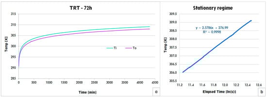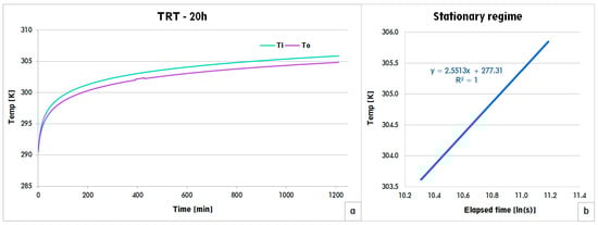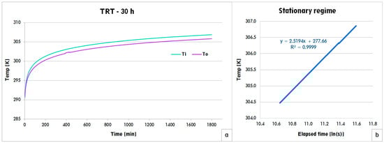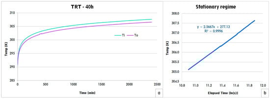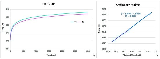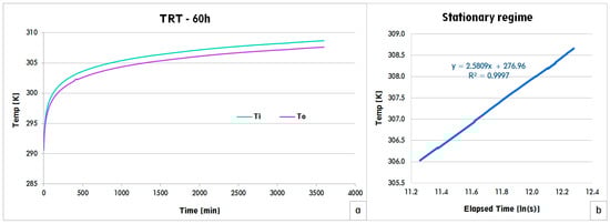 - In the borehole of the study, the thermal conductivity of the ground calculated from the TRT did not present substantial variations when using different test durations. This may be due to the fact that the borehole was water-filled instead of being grouted (as usual). Also, the homogeneous geological environment (granite) of the area may have had some influence on this result (Figure 12).