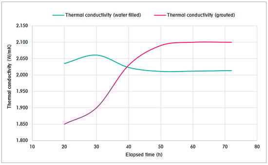 | Test Duration (h) | Thermal Conductivity (Water-Filled) (W/m·K) | Thermal Conductivity (Grouted) (W/m·K) |