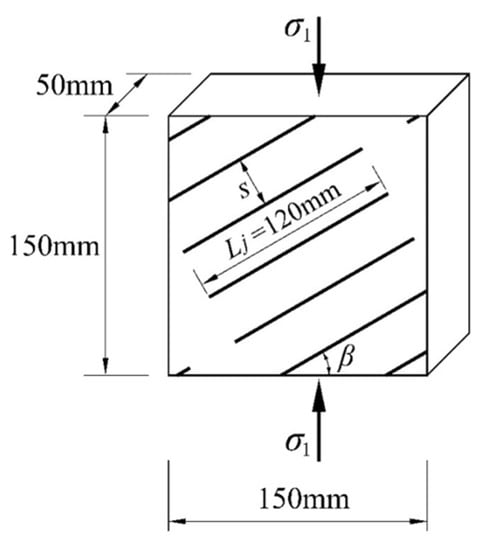 The dimension of the specimens is 150 × 150 × 50 mm (height × width × depth). A single set of parallel joints penetrating through the thickness is regularly arranged (see Figure 1). In this study, both joint center distance c (the distance between the two adjacent joints on a joint plane) and joint continuity factor k (the ratio of the length of a single joint to the joint center distance) are fixed, i.e., c = 150 mm and k = 0.8. Accordingly, the joint length is Lj = kc = 120 mm, except for those intersect with the edge of the specimens. The combined variation of the two geometrical parameters, i.e., joint inclination angle β and joint spacing s (the angle between the joint plane and the loading plane, and the distance between the two adjacent joint planes, respectively), are investigated. For jointed specimens, five values of β and three values of s are considered, namely, β = 0°, 30°, 45°, 60° and 90°, and s = 75, 60 and 30 mm. For the intact specimen, s = 150 mm is assumed. Therefore, in total, sixteen joint configurations are included in the physical experiment and PFC modeling (see Table 1).