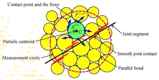 In a PFC2D model, microscopic quantities, such as particle displacements, contact forces of bonds or SJ contacts are computed. Since the model is discrete, continuum quantities such as stresses and strain rate do not exist at each point in a particle assembly. Averaging procedures are necessary for transferring from the micro-scale to a continuum. In PFC2D, continuum quantities are defined with respect to a specified measurement area, referred to as “measurement circle” [38] (see Figure 2). By using measurement circles, continuum quantities can be computed and monitored.