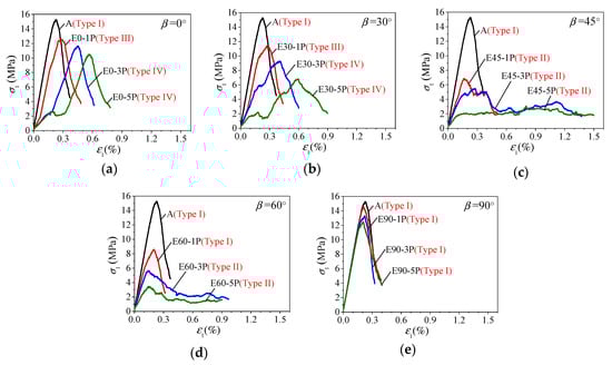 Axial stress–strain curves of all specimens by PFC modeling: (a) β = 0°, (b) β = 30°, (c) β = 45°, (d) β = 60° and (e) β = 90°.