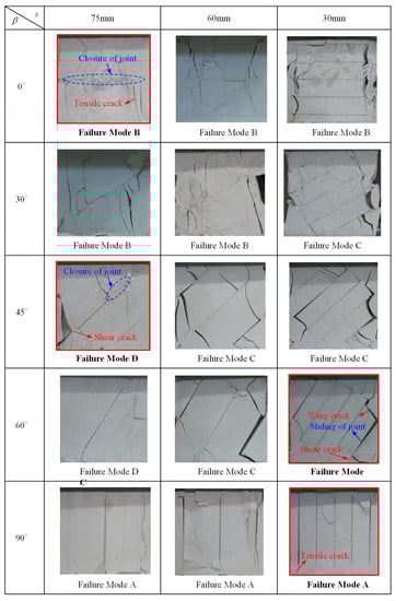 Figure 5 shows the failure phenomena at the end of the physical tests for all jointed specimens. In total, four failure modes were identified, i.e., Mode A: axial cleavage, Mode B: crushing, Mode C: stepped failure and Mode D: shear failure.