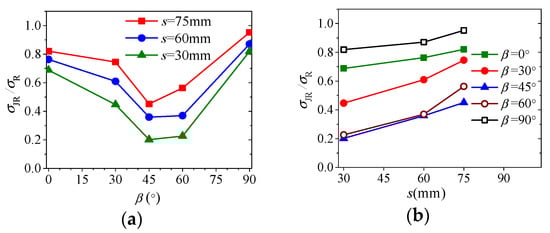 The normalized peak strength versus the two joint geometrical parameters: (a) σJR/σR vs. β and (b) σJR/σR vs. s.