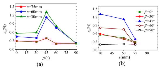 The last peak strain vs. the two joint geometrical parameters: (a) εf2 vs. β and (b) εf2 vs. s.
