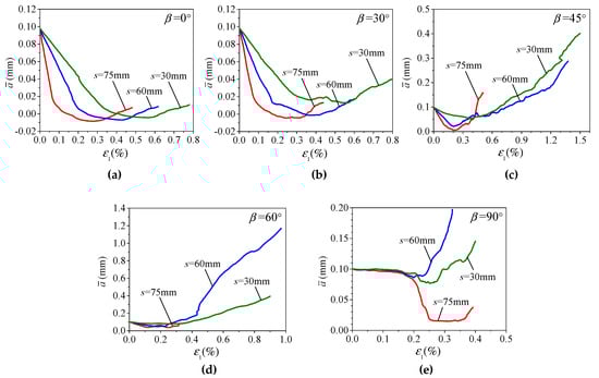 Evolution of average aperture of SJ contacts in the whole specimen () at: (a) β = 0°, (b) β = 30°, (c) β = 45°, (d) β = 60° and (e) β = 90°.