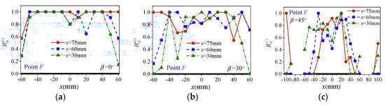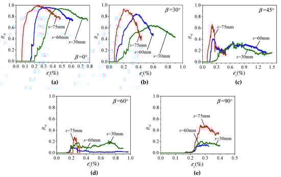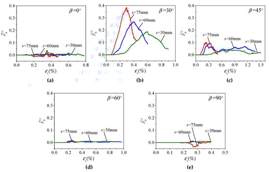 Figure 22 depicts distributions of ratio of closed number of SJ contacts in measurement circles () along the central ML at Point F for all jointed specimens. At peak strength, it can be seen that: (1) most of the SJ contacts along the ML closed for specimens with β = 0° and 30° (except for those on the joint tips), and majority of the SJ contacts in the middle of the ML closed for specimens with β = 45°, while none of them and a little of them closed for specimens with β = 60° and β = 90°, respectively; (2) for a given joint inclination angle β, decrease with joint spacing s in general.