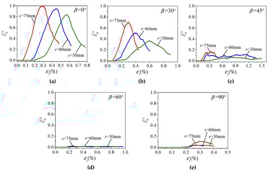 where, is the maximum value of in all jointed specimens, which occurs in specimen E0-1P (β = 0° and s = 75 mm) for this study; and normalized average normal and shear forces of SJ contacts in the whole specimen, respectively.