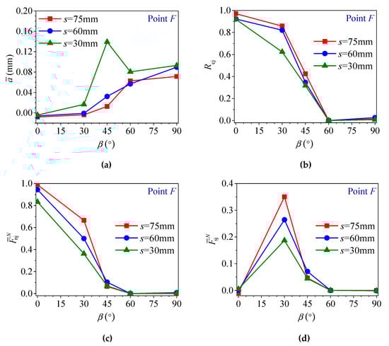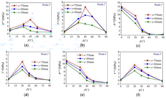 Figure 24 plots the average normal and shear stresses of the rock bridge phase, the joint phase and the joint plane of the central ML at Point F vs. β. At peak strength, it was found that: (1) at each joint spacing s, vs. β, vs. β, vs. β and vs. β are inverted V-shaped curves with the maxima at β = 30° or 45°, while and decreases with β; (2) for a given joint inclination angle β, all these stresses increase with s.