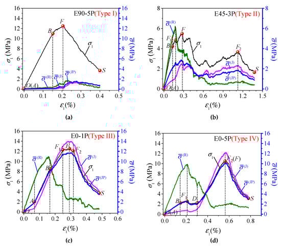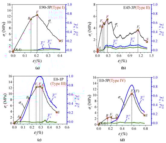Evolution of , and in the jointed specimens with different types of deformation behaviors: (a) E90-5P (Type I), (b) E45-3P (Type II), (c) E0-1P (Type III), and (d) E0-5P (Type IV).