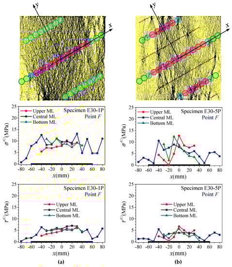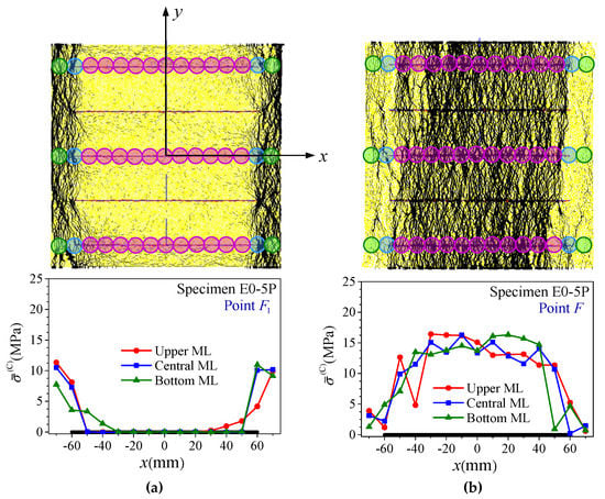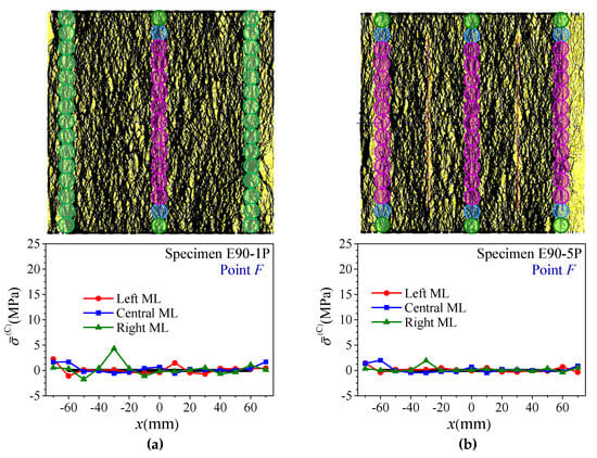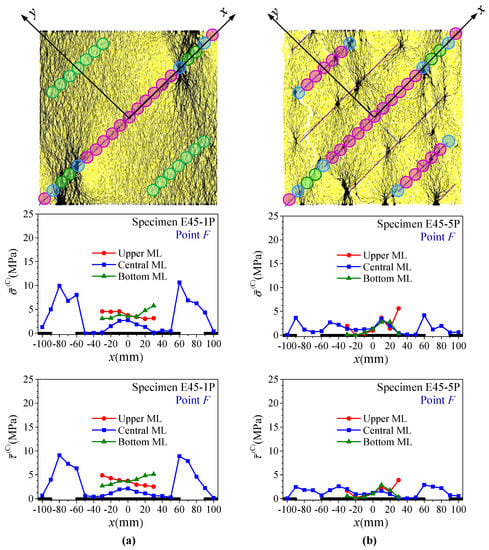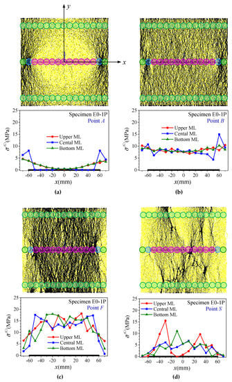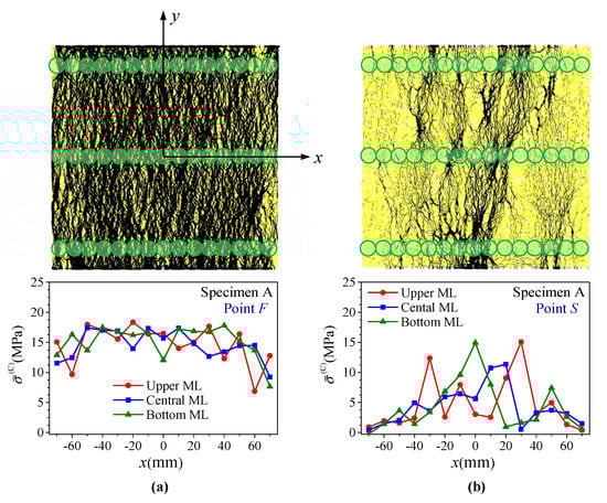 For the intact specimen (A) at Point F and S, Figure 15 shows distributions of contact force chain and the average normal stresses in the local measurement circles () along the three MLs. Here, x is the distance from the center of the measurement circle to the center of the ML. In a picture of contact force chain, the resultant forces acting on contacts are indicated by the black bars whose thickness is proportional to the force magnitude. It can be seen that the contact forces almost evenly distributed in the specimen at peak strength (Point F), while it concentrated in the middle region at the end of the test (Point S) due to severe damage of the matrix. Distribution of along the upper, central and bottom MLs matches with the picture of contact force chain, namely, larger means that the measurement circle locates at a region with concentration of contact force and vice versa.