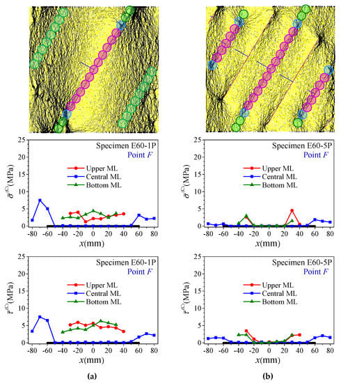 Figure 21 shows distributions of contact force chain and and along the three MLs at Point F for specimens with β = 60° at s = 75 and 30 mm, i.e., E60-1P and E60-5P. For the two specimens at peak strength (Point F coincide with F1), load-carrying arches around the joints still existed and normal and shear stress on the central joint plane was totally carried by the rock bridges.