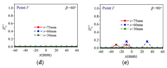 Distribution of along the central ML at Point F for all jointed specimens: (a) β = 0°, (b) β = 30°, (c) β = 45°, (d) β = 60° and (e) β = 90°.