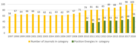 The energy category is by definition, the category of energy and fuels. Energy and fuels covers resources on the production, use, application, conversion, and management of nonrenewable energy (combustible) fuels (such us wood, coal, petroleum, and gas) and renewable energy sources (solar, wind, biomass, geothermal and hydroelectric). However, resources dealing with nuclear energy and nuclear technology appear in the nuclear science and technology category. The number of journals in this category may change every year, depending on new journals (upon request and at least 3 years of evaluation), withdrawals, or changes of category. In particular, the number of journals in this category has increased from 58 in 1997 to 112 in 2019.