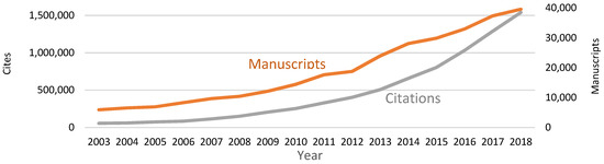 MDPI’s Energies journal is included in the energy and fuels category. This category covers resources for the development, production, use, application, conversion, and management of non-renewable fuels such as wood, coal, oil, and gas, and renewable energy sources such as solar, wind, biomass, geothermal, and hydroelectric. Within this last category, it does not cover nuclear energy or technology (nuclear science and technology category). Figure 1 shows the evolution of energy and fuels from its beginnings in 1997, with 58 journals, to the 103 journals registered in 2018. The figure shows the position of MDPI’s Energies journal in relation to the category, being predominantly in the second quartile and spending only 2 years (2013 and 2018) in the third quartile. Data on the number of published articles in the energy and fuels category were not available until 2003. From 2003 (5928 articles, 2% of the total recorded) to 2018 (39,585 articles, 13% of the total recorded) 302,650 articles have been published, a gradual increase of 11% over the first recorded value (Figure 2). The number of citations has followed a similar relationship to the number of articles to more published documents. The evolution goes from 56,509 citations in 2003 (1% of the total recorded) to 1,540,158 citations in 2018 (7,564,902 total citations), where the highest annual increase in percentage occurred (from 2015 with 11% to 2018 with 20% of the total recorded). If we relate the amount of articles/number of citations, we obtain a decreasing evolution; at first there is a ratio of 0.1 until reaching 0.03 in 2018.