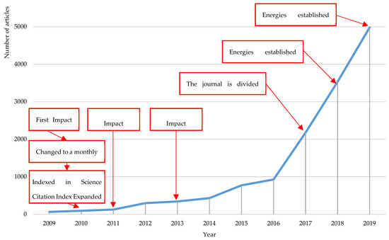 MDPI’s Energies journal was founded in 2008, and two years later it was indexed in the Science Citation Index Expanded (SCIE) in the third quartile. Figure 3 shows the most significant milestones since its foundation and their relations to the number of articles published. One year later, in 2011, it reached the second quartile where it remained until 2013; then it fell to the third quartile. In 2014 it reached the second quartile again and remained there until 2017, where the journal was divided into five topical sections: Electrical Power and Energy System, Energy Fundamentals and Conversion, Energy Sources, Energy Storage and Application and Sustainable Energy. In 2018 the journal was placed in the third quartile and added two new sections: Thermal Management and Energy Economics and Policy. In 2019 a total of eleven new sections were established: Hydrogen Energy; Energy and Buildings; Geo-Energy; Energy and Environment; Bio-Energy; Solar Energy and Photovoltaic Systems; Wind, Wave and Tidal Energy; Smart Grids and Microgrids; Advanced Energy Materials; Electric Vehicles; State-of-the-Art Energy Related Technologies.