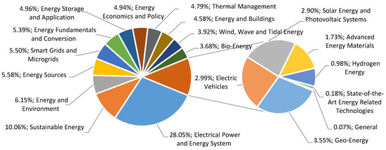MDPI‘s Energies journal is a journal that promotes publication in nine thematic areas, as shown in Table 1. Each thematic area includes different topics, except in Exergy and Energy Research and Development sections. Based on the subject areas, the journal has developed 20 sections with 931 Special Issues between 2020–2021 and 7416 documents published until April 2020. Figure 4 shows the distribution by percentage of articles according to sections. The five sections with the most publications are the most generic, such as Electrical Power and Energy System with 2080 documents (28.05%), Sustainable Energy with 746 documents published (10.06%), Energy and Environment with 456 documents (6.15%), Energy Sources with 414 documents (5.58%), and Smart Grids and Microgrids with 408 documents (5.50%). The remaining sections have less than 401 documents published. Figure 5 shows the distribution of Special Issues according to section. The Electrical Power and Energy System section is the one with the highest number of documents published and the highest number of Special Issues with 12.57% and 117 Special Issues. The rest do not have a direct relationship between sections or the number of documents published. The Special Issues are distributed in the more specific sections, such as Smart Grids and Microgrids (10.42%), Energy Economics and Policy (7.52%), Energy and Buildings (6.44%), and Electric Vehicles (6.44%).