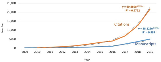 Figure 6 shows the relationship between published documents and the number of citations received. Both the documents and the citations maintain an exponential distribution over the years. There is also a relationship (citations/published documents) that the greater the number of published documents the greater the number of citations; the relationship between the two is not uniform, going from approximately 1 in 2010 to an increase of 4.69 in 2014. After that year, the tendency is to decrease until it reaches 3.07 in 2017, and again, there is an increase until the relationship reaches 4.3 in 2019. This increase may be the result of a good policy on Special Issues focused on very specific topics and looking for publishers who specialize in them.