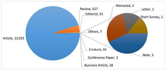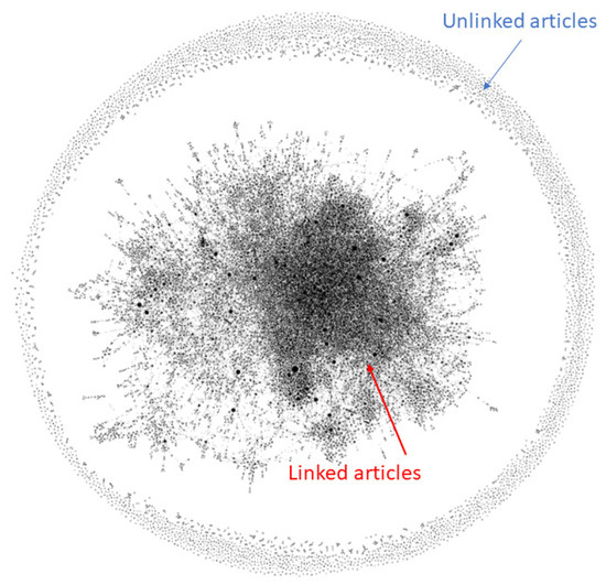 In this work, a general search was conducted, wherein 13,740 documents up to 2020 have been obtained. In Figure 7, they are represented along with their relationships. A filtering process was performed to discard documents not linked to the core relationship set (unlinked articles in Figure 7). Only 9865 documents were found (core of Figure 7) to be strongly linked—this means manuscripts that are cited or cite other manuscripts of the journal. The results imply a final total of 19,835 relations. Figure 7 shows the distribution of the 14 communities detected after the filtering process with Gephi. Although there are several communities with well differentiated concentrations, the majority show strong interactions with various themes.