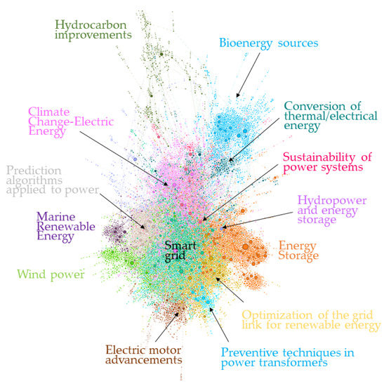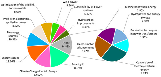 Figure 9 presents the contribution of each community as a percentage. Due to the interrelationships in Figure 8, it is difficult to see the total size of each community. There are four communities with contributions of more than 10%, including smart grids with 16.74%, which is the largest (advances in the application of communications technology to electrical networks), followed by climate change–electric energy with 12.62% (renewable sources as an option for reducing the effects of climate change and the greenhouse effect), followed by energy storage with 12.24% (advances in ecological storage sources. and their uses are evaluated according to application), and bioenergy sources with 10.51% (evaluates innovations in alternative biological-based sources).