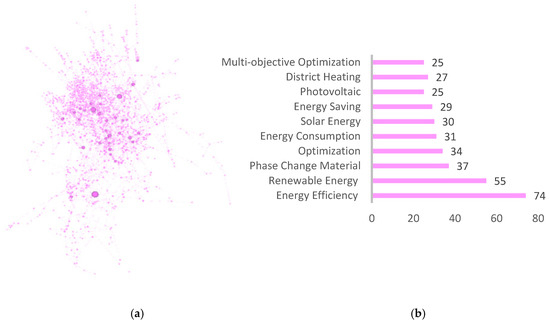 This community is made up of 1251 documents. It is the largest community with a contribution of 16.74% to published documents. Figure 12a shows the concentration of the nodes, where there are many medium-sized nodes. The three most outstanding nodes include a widely cited research article [30], a review with few but very related citations [31], and a summary of a Special Issue that has no citations, although its author does have strong collaborative links [32]. The three nodes are: