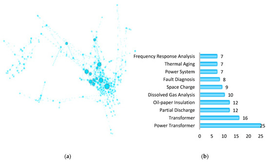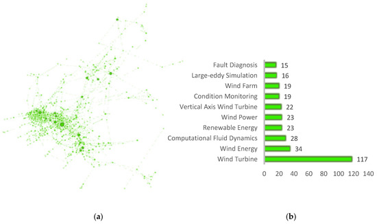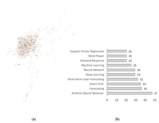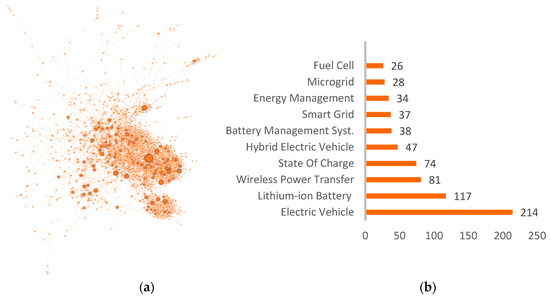 Figure 14b shows the top 10 keywords of this community—6095 different keywords. The ten most representative keywords account for 11.42% of those used in this community. Among the most representative keywords are the ones related to the EV with 3.51% and hybrid electric vehicle (0.77%), and those related to the smart grid distribution (0.61%) and microgrid (0.46%); and the rest include lithium-ion battery (1.92%), wireless power transfer (1.33%), state of charge (1.21%), battery management system (0.62%), energy management (0.56%), and fuel cell (0.43%). Lithium and fuel cell batteries are the most studied storage technologies recently driven by the need to lower EV battery costs to make them competitive.