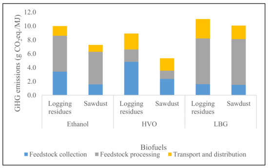 LBG production from logging residues and sawdust results in GHG emissions of 11 and 10 g CO2eq./MJ, respectively (Figure 2), corresponding to GHG emission reductions of 88 and 89% respectively when compared to the fossil diesel reference value of 94 g CO2eq./MJ. The liquefaction of 1 Nm3 of raw biomethane results in 21 MJ of LBG and is the only product generated from the processing [17]. The gasification and upgrading process is responsible for higher emissions as it includes various steps such as tar removal, sulfur removal, and CO2 removal before methanation, and it consumes electricity. Due to the large amount of pressure used in the water-scrubbing technology, the consumption of electricity increases. Some authors have reported that plants using amine scrubbing technology for upgrading, instead of water scrubber as assumed here, have lower GHG emissions as it operates slightly above atmospheric pressure, which reduces the need for a compressor and can work by implementing the only blower, which reduces the electricity demand [17].