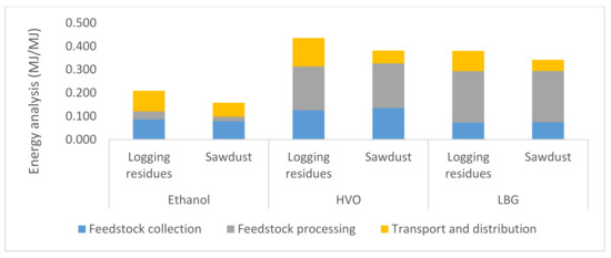 Energy analysis (MJ/MJ) for ethanol, HVO, and LBG from logging residues and sawdust.