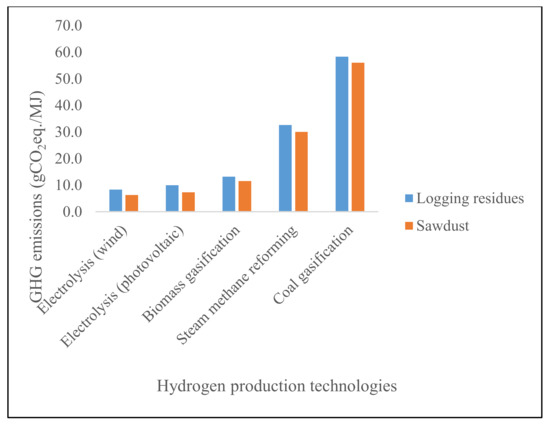 As reported in several studies [44,45], the use of hydrogen for bio-oil upgrading could be the major emission hotspot in the life cycle of HVO depending on the source of hydrogen production. For fair understanding and realizing the importance of renewable sources for hydrogen production, sensitivity analysis is performed for evaluating the impact of different sources for hydrogen production on the overall life cycle GHG emissions of HVO. Based on the literature, different sources of hydrogen production such as electrolysis, biomass gasification, steam methane reforming, and coal gasification are studied here [49]. GHG emission factors for hydrogen production from various methods are given in Table 5 [50].