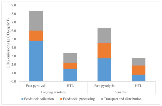 HVO production from logging residues and sawdust results in GHG emissions of 8 and 5 g CO2eq./MJ, respectively (Figure 2), corresponding to GHG emission reductions of 91 and 94% respectively when compared to the fossil diesel reference value of 94 g CO2eq./MJ. Emissions from forest residue-based HVO results in more or less half of the default life cycle GHG emissions, i.e., 14 g CO2eq./MJ from waste vegetable oil-based HVO being currently used in Sweden. Biomass conversion to HVO consists of three steps: pretreatment, fast pyrolysis, and upgrading, and it consumes heat, electricity, and hydrogen as the main input. Many authors have reported that the production and use of hydrogen during upgrading constitute the major emission hotspot in the life cycle [44,45,46,47]. In this case study, hydrogen use is considered to be renewable in origin produced via electrolysis and therefore results in lower emissions as compared to [30]. Life cycle GHG emissions are largely dependent on the source of hydrogen and switching from non-renewable to renewable sources significantly reduces GHG emissions. Furthermore, the oxygen content of bio-oil produced after pyrolysis determines the hydrogen demand to meet the standard oxygen level from the refinery and engine perspective [48]. The impact of emerging technologies that can result in lower oxygen content of bio-oil change, e.g., hydrothermal liquefaction (HTL) and change in hydrogen production systems, is further studied in the sensitivity analysis.
