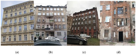 Four specified technical conditions of tenement houses in Wroclaw (according to Table 1 and described in the text): (a) good; (b) average; (c) bad; (d) very bad.