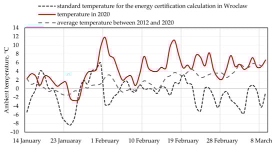 To increase the accuracy of the calculations, the data of weather observed during the tests were used. It should be noted that in the analyzed period, the average ambient temperature was higher than in previous years. Figure 2 compares these values against the average values from the last 10 heating seasons in Wroclaw and the average temperature from the 30-year period, which are used in the calculations for energy certification of buildings [29].