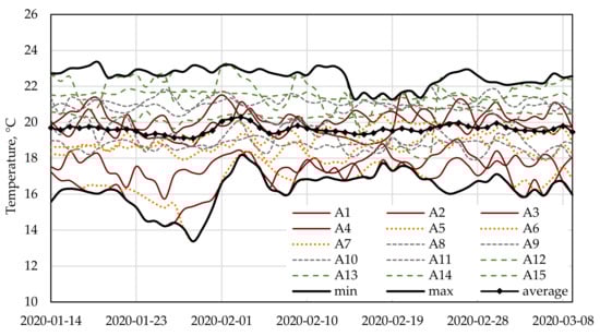 Internal temperature is a very important factor that affects energy consumption for heating in residential premises. In the case of the tested apartments, a correlation between the average internal temperature and the type of heating system used was observed, as shown in Figure 3. In flats supplied from central heat sources (A8–A11) and individual gas boilers (A12–A15), this profile was correct and no significant differences in temperature were observed in different rooms. The temperature of the examined apartments oscillated between average and maximum values. The inhabitants were able to maintain thermal comfort in the rooms without much effort. Indoor temperature is not only based on thermal comfort needs, but is also an indicator of problems related to energy poverty or the inability to provide adequate temperature [31]. In some of the apartments, the average interior temperature during the research period was about 16 °C, and the lowest recorded in the bathroom was 13 °C. This is mainly due to the heating characteristics of solid fuel stoves (A1–A4) and the most expensive electric-powered systems in Poland (A5–A7). In apartments heated with systems powered by solid fuel or electricity, the interior temperature profile is not correct. Significant differences in the measured air temperature in different rooms in the apartment were observed, and temperature changes oscillated between average and minimum observed values.