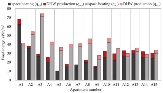 The actual unit consumption of final energy for space heating and DHW preparation and the demand calculated according to the assumptions of simulation 3 (engineering calculations) are shown in Figure 4. The results for individual apartments are very different. These differences were expected due to the location of the apartment in the building and its insulation. For example, apartments A10, A12, A14, A15 are in a good technical condition and have lower than other average heat transfer coefficient (Table 1), so their unit energy demand should be the lowest. Despite this, the lowest values are observed in A5–A9, and the most significant differences between energy consumption compared to expectations are in A1–A10. The reasons for such unlike energy consumption compared to expectations are very low temperature of indoor air in the premises, insufficient ventilation, and/or the influence of the environment, i.e., the flow of thermal energy from zones adjacent to the apartment. Little insulation of interior walls causes intensive heat exchange between zones in the building. In the case of A9 these zones are exceptionally warm (for example the temperature in the staircase adjacent to apartment A9 exceeded 22 °C), so its unit energy demand is low. The opposite effect was observed in apartment A1, where the adjacent spaces are extremely underheated. This shows how important it is to analyze in detail the temperature of adjacent spaces, such as staircases, basements, and attics. These are important elements that influence the energy gap, which are discussed in detail later in the paper.