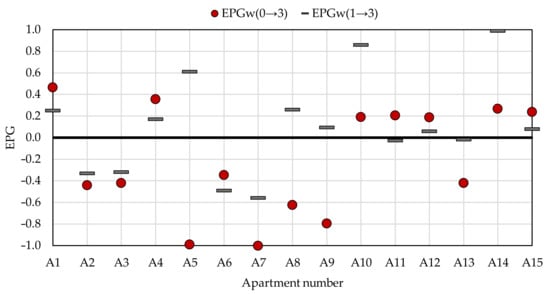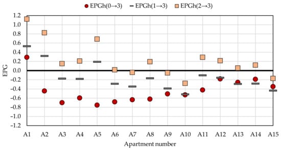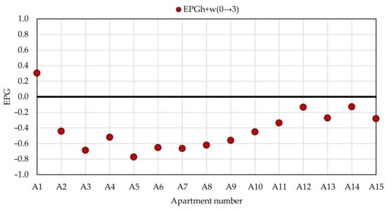 In Table 4 an expected energy gap between measurement and engineering calculations, due to significant differences in ambient temperature (see Figure 2), is presented (). These values range from −0.31 to −0.39. Comparing the results of and , Table 4, by extending the analysis with the actual parameters of the use of the premises, most of the apartments (A2–A11) have a greater negative EPG, which means that they actually consume less energy than expected. Several apartments (A1, A12–A14) have higher values, i.e., they consume more energy than calculated.