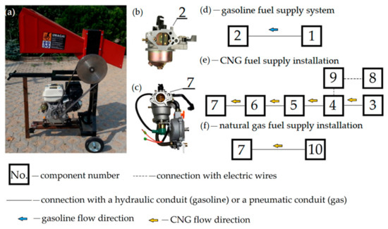 The tests were performed on (a) a wood chipper with branch logger mechanism; (b) a gasoline adapted carburetor system; (c) a carburetor system adapted to natural gas and CNG; (d) a gasoline fuel supply system, where: 1—fuel tank, 2—gasoline carburetor; (e) CNG fuel supply system, where: 3—high-pressure tank (20 MPa), 4—gas heater, 5—first-stage regulator (from 20 MPa to 0.6 MPa), 6—second-stage regulator (from 0.6 MPa to 0.01 MPa), 7—natural gas and CNG carburetor; 8—DC converter from 12 V to 230 V AC; 9—12 V battery (f) natural gas fuel supply system, where: 10—household gas installation (minimum pressure 0.01 MPa).