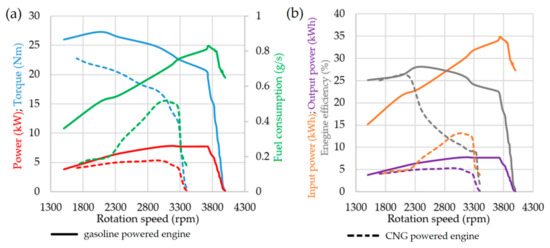 Characteristics of the Lifan iGX 390 engine powered by gasoline and CNG, in terms of (a) power, torque, fuel consumption and efficiency; (b) efficiency, energy input and energy output. The colors refer to the individual physical quantities, and the line type to the fuel type.